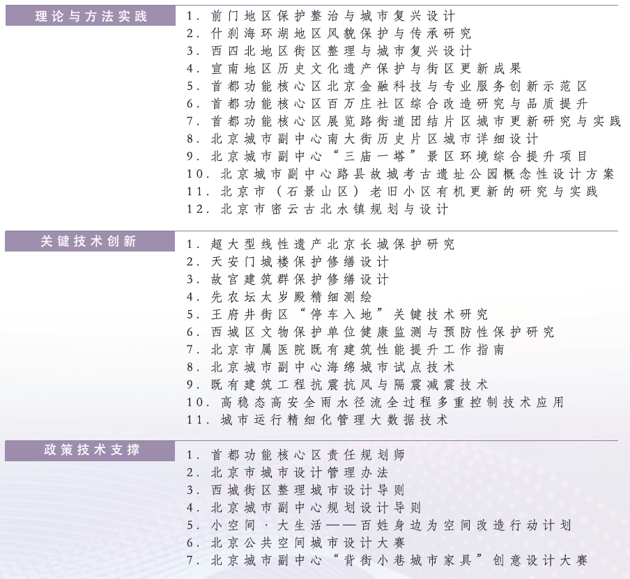 多年來,北京建筑大學在“歷史城市保護更新規劃理論與方法”、“建筑保護與更新關鍵技術”、“城市基礎設施功能提升關鍵技術”三大研究方向已形成一定研究基礎,代表項目包括: